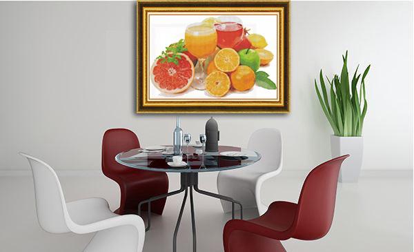 Nếu phòng khách phù hợp treo những bức tranh bát mã, thư pháp,... thì không gian bếp nên lựa chọn tranh thêu hoa quả, cánh đồng xanh,...
