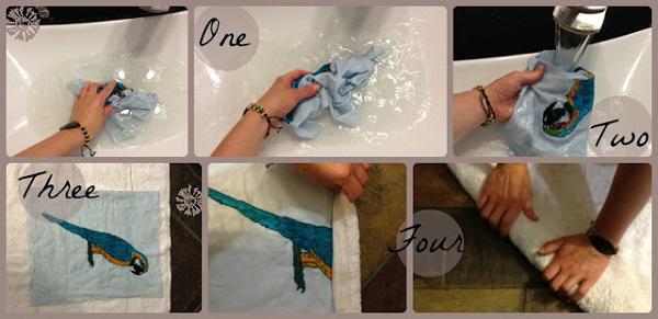 Sử dụng nước lạnh để giặt tranh chữ thập, ngâm trong nước có pha xà phòng một khoảng thời gian, sau đó rửa nhẹ nhàng thật sạch. Bóp nhẹ cho nước trên tranh ráo bớt rồi trải tranh lên một khăn trắng sạch, từ từ cuộn tròn khăn lại, toàn bộ số nước trên tranh sẽ được khăn trắng thấm hết. Mở tranh ra rồi treo bằng kẹp lên dây phơi, luôn phải giữ tranh phẳng, không gấp nếp hay vắt ngang qua dây.