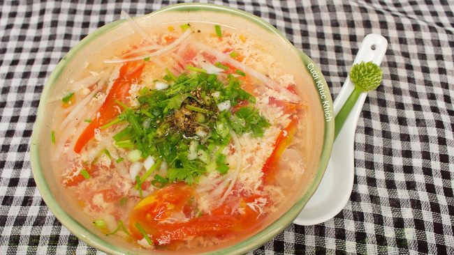 Thành phẩm: Món canh cà chua trứng với những đường vân trứng như những "đám mây" bồng bềnh trông vô cùng đẹp mắt. Nước dùng chua nhẹ, được nêm nếm vừa phải. Đây chắc chắn là một món canh mà ai cũng có thể thực hiện được!