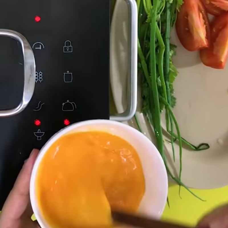 Với trứng, chị em đập ra bát rồi dùng đũa hoặc dụng cụ đánh trứng đánh thật bông.