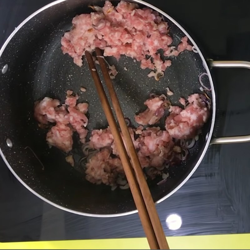 Sau khi hành dậy mùi thơm, bạn cho phần thịt bằm vào chảo, xào nhẹ đến khi thấy thịt hơi săn lại thì cho thêm vào nồi 1/2 muỗng cà phê hạt nêm, rồi tiếp tục xào đến khi thịt chín hoàn toàn.