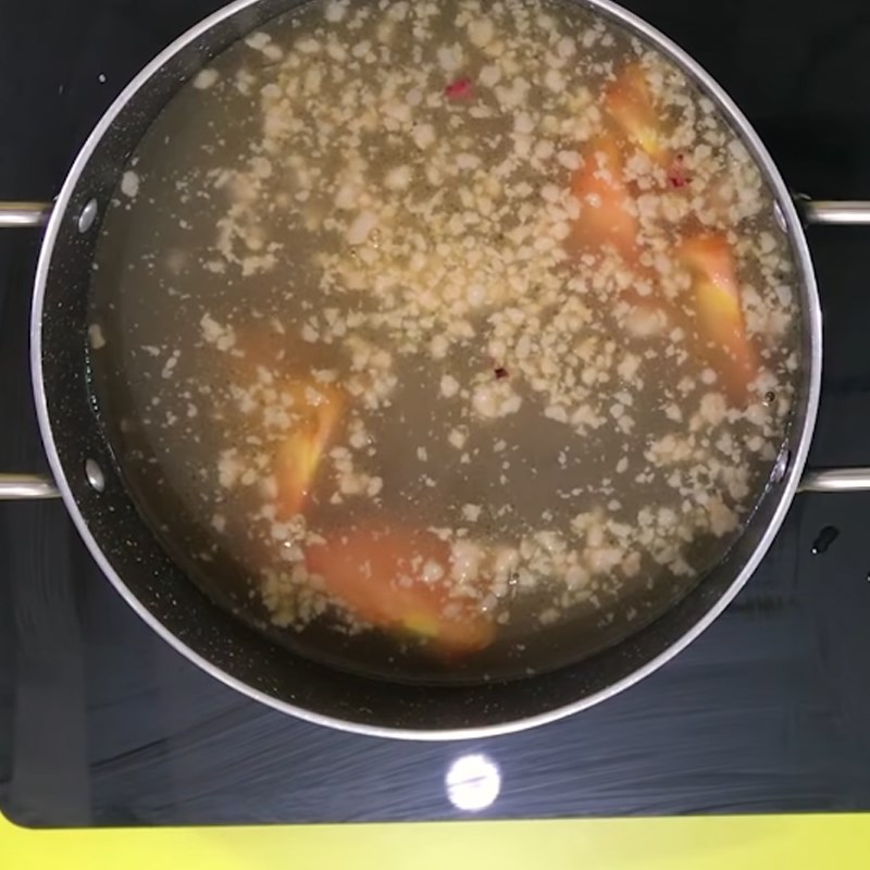 Bạn cho 1/2 lượng cà chua vào nồi thịt đã xào. Xào cà chua cùng với thịt trong khoảng 5 phút để tạo màu cho món canh. Kế đến, đổ khoảng 1 lít nước vào nồi, đậy nắp lại và đun sôi ở lửa vừa.
