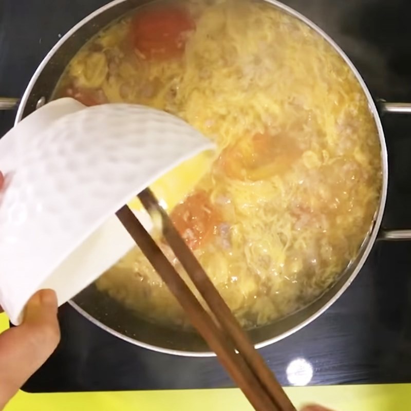 Kế đến, cho hết lượng cà chua còn lại vào nồi, giảm lửa nhỏ. Nêm nếm lại món canh với 1 muỗng cà phê muối, 2 muỗng cà phê hạt nêm, đảo đều rồi tăng lửa vừa để canh sôi lại lần nữa.
