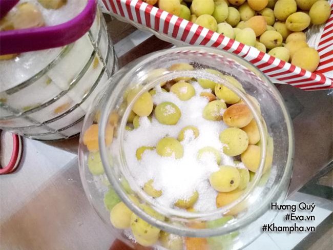 Bước 4: Cho từng ít mơ vào bình, cứ một lớp đường thì thêm một lớp mơ cho tới khi đầy bình.