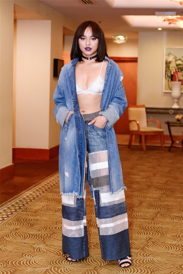 Mai Ngô diện đồ theo mốt lộ nội y. Tuy nhiên cách phối khiến trang phục trông luộm thuộm