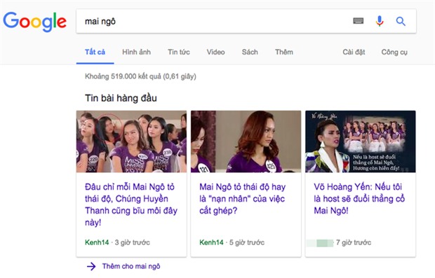 kiếm với từ khóa "Mai Ngô" trên Google trong 0,61 giây mà phần nhiều trong số đó là những lùm xùm không hay.