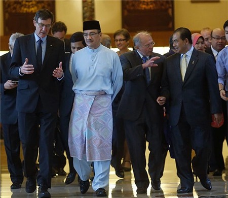 Quyền bộ trưởng Giao thông Malaysia Hishammuddin Hussein (áo trắng), Tướng Augus Houston, trưởng Trung tâm Điều phối Tìm kiếm của Úc (bìa trái) trong cuộc họp báo tại Kuala Lampur hôm 2-5. |