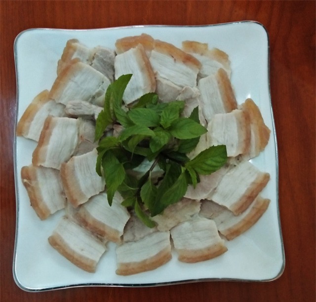 Thịt ba chỉ heo mua về rửa sạch, dùng dao cạo phần bì heo. Đun nồi nước sôi, cho vào chút muối và 1 củ hành đập dập và thịt vào luộc. Thịt chín vớt ra, cho vào 1 bát nước đun sôi để ngội cùng vài viên đá, sau đó vớt ra đem thái bỏ vào đĩa.