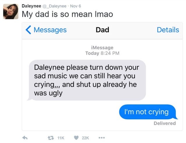 Daleynee đã chia sẻ tin nhắn này lên Twitter cùng caption: "Bố mình xấu tính ghê, ha ha" và bất ngờ nhận được 22 nghìn lượt like cùng hơn 11 nghìn lượt retweet.