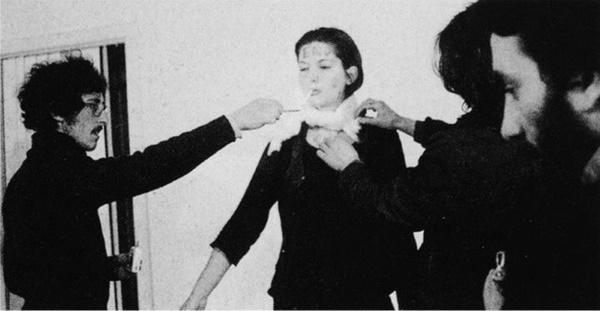 Một người đã dùng dao khắc lên bụng nữ nghệ sĩ. Máu cô tuôn ra. Vài người khác nếm những giọt máu ấy. Họ cùng nhau kéo lê cô như một hình nhân. Một gã thậm chí còn cố đặt cô lên bàn và cưỡng bức cô nhưng đã bị ngăn lại.