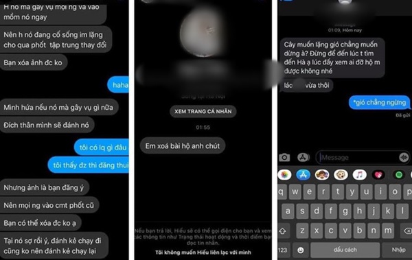 “Em xóa bài hộ anh chút. Cây muốn lặng gió chẳng muốn dừng à? Đừng để đến lúc tao tìm đến H. ạ, lúc ấy xem ai đỡ hộ mày được không nhé. Láo vừa thôi”, anh chàng này nhắn qua.