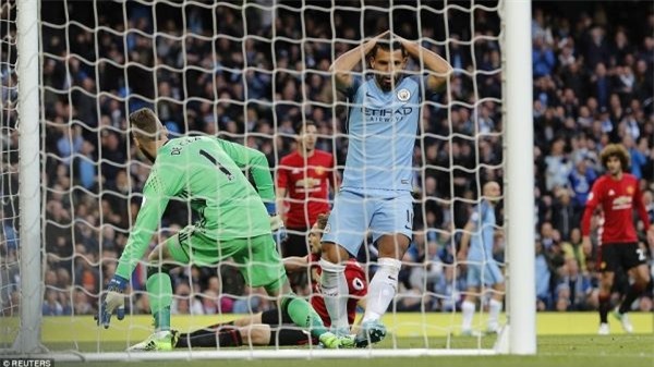 Phút 32, Aguero dứt điểm gần mép vòng cấm và Man United phải nhờ tới tài năng của De Gea mới không bị thủng lưới.