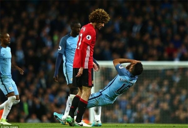 Aguero ngã xuống sau khi bị Fellaini húc đầu |