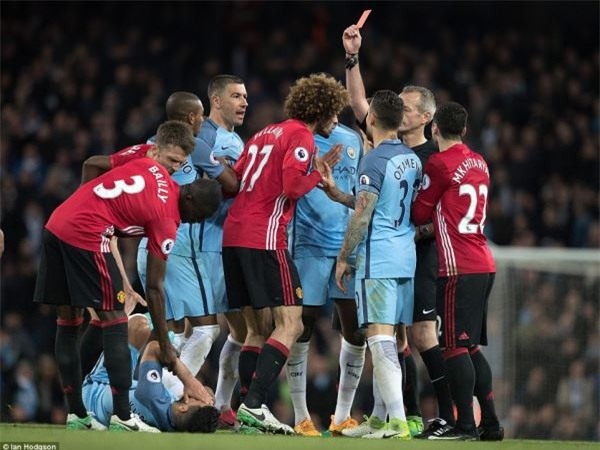Fellaini nhận thẻ đỏ ở cuối hiệp 2 |