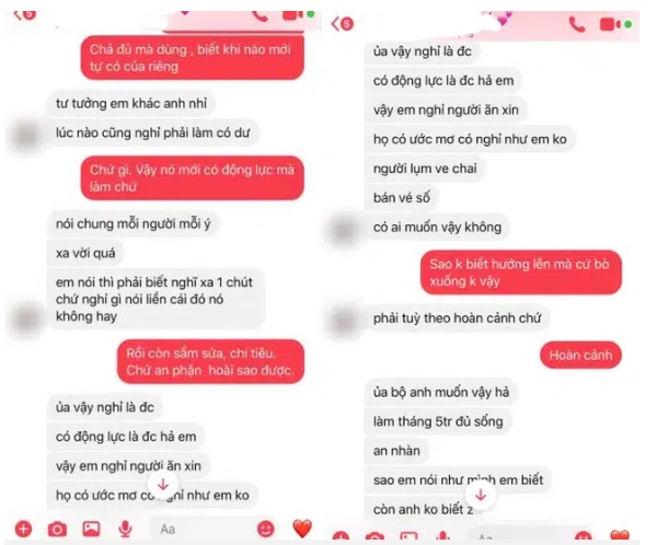 “Tư tưởng em khác anh nhỉ, lúc nào cũng nghĩ phải làm có dư. Mỗi người mỗi ý, xa vời quá. Có động lực là được hả em, vậy em nghĩ người ăn xin họ có ước mơ có nghĩ như em không. Người lụm ve chai, bán vé số, có ai muốn vậy không?”.