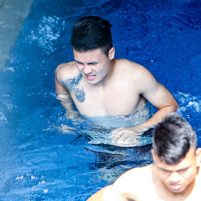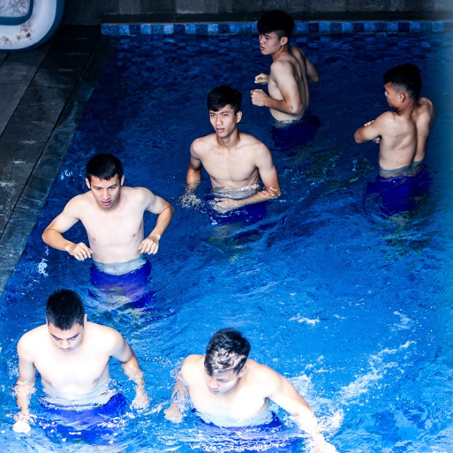 Mới đây, các cầu thủ U23 Việt Nam được trợ lý HLV Bae Ji Won hướng dẫn khởi động dưới bể bơi nước lạnh để phục hồi thể lực.