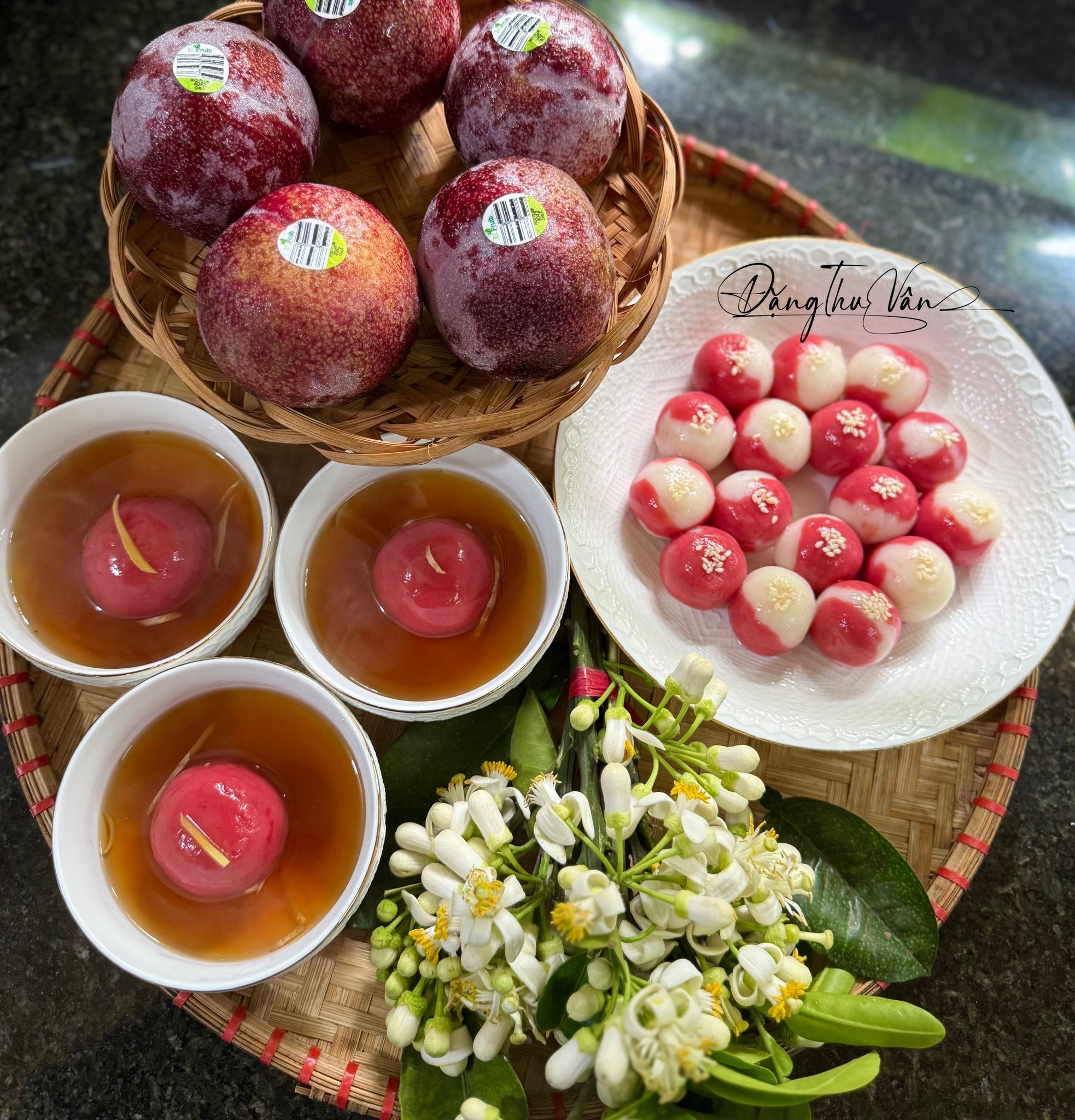 Mâm lễ có bánh trôi hồng trắng tượng trưng cho sự viên mãn, bát bánh chay ngọt dịu cùng đĩa trái cây tươi và nhành hoa bưởi thơm nhẹ của tháng Ba. Ảnh Thu Vân