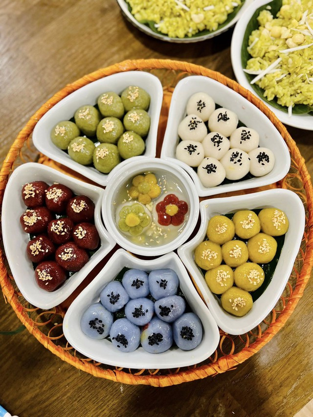 Mâm bánh trôi ngũ sắc được làm từ màu rau củ của mẹ đảm Nguyễn Thắm (Hà Nội)