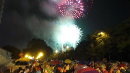 Cùng thời điểm 21h, phía "đầu cầu" Hà Nội, những tiếng vỗ tay rộn vang trong mưa khi những màn pháo hoa tỏa sáng trên bầu trời Hồ Gươm. Bất chấp thời tiết không thuận lợi, màn pháo hoa đẹp mắt vẫn trôi đi quá nhanh trong cảm nhận của nhiều người...