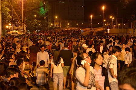 Trên đại lộ Võ Văn Kiệt đoạn từ cầu Ông Lãnh đến cầu Calmette, hàng ngàn người dân đổ về để tìm vị trí thuận lợi xem pháo hoa khiến toàn bộ khu vực này "tê liệt". Dòng người đi bộ phải len lỏi qua “rừng” xe máy mới có thể đến được khu vực gần hầm sông Sài Gòn.