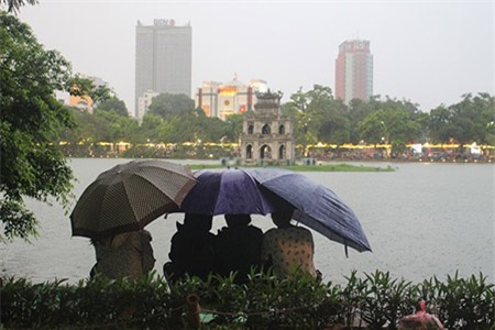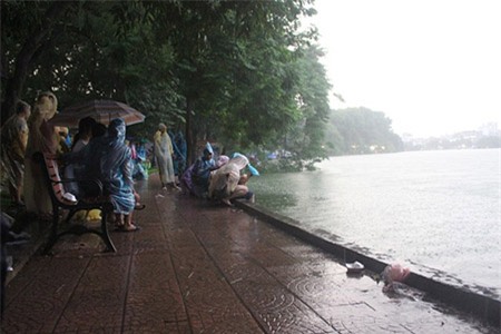 3 bác gái này có mặt ở Hồ Gươm từ rất sớm và trú mưa ngay dưới một bức tranh hoa bên