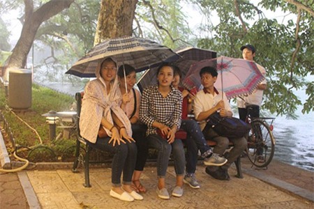 Một nhóm bạn trẻ quyết không rời vị trí đẹp dù trời ngày càng mưa nặng hạt