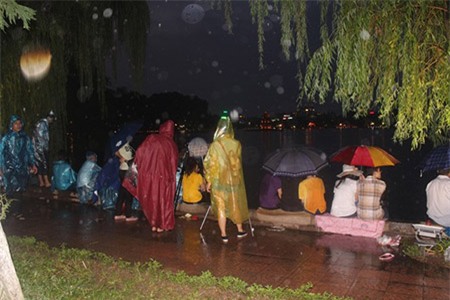 Hàng vạn người đội mưa thưởng thức màn pháo hoa tại hồ Văn Quán (Ảnh: Tiến Nguyên)