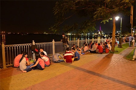 Trong khi đó, ở khu vực kênh Tàu Hũ – Bến Nghé, dưới chân cầu Khánh Hội, nhiều bạn trẻ trải bạt ngồi ăn uống “xí chỗ” chờ xem pháo hoa.