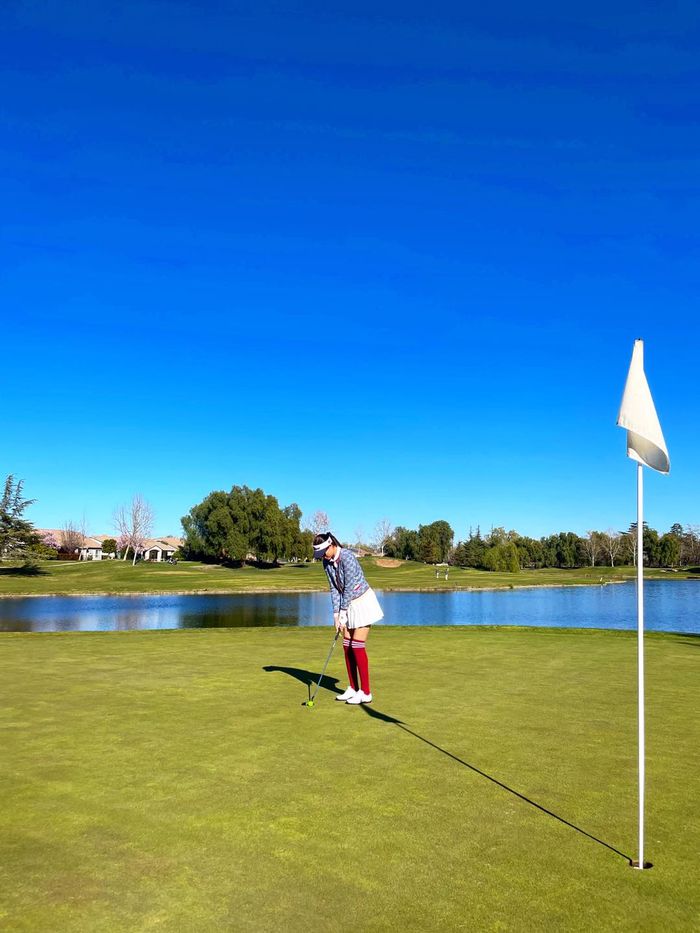 Hiền Hồ cũng chỉ mới gia nhập vào hội mỹ nhân Việt mê golf. Cô thường chọn cho mình những outfit trẻ trung, năng động, phù hợp với độ tuổi và cá tính riêng. Với khuôn mặt "búng ra sữa", vóc dáng chuẩn chỉnh, tổng thể hoàn mỹ không điểm chê.