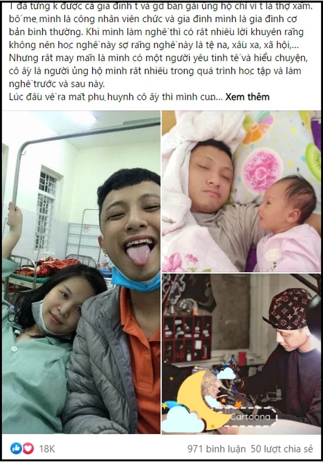 "Năm thứ 2 Đại học mình đi chạy xe ôm công nghệ, mục tiêu chỉ là kiếm thêm tiền trang trải việc học, đỡ đần cho bố mẹ và thoả mãn đam mê vẽ vời. Công việc xe ôm khá vất vả, lúc nắng lúc mưa khiến mình hiểu được việc kiếm tiền không hề dễ dàng. Sau đó mình đã loé lên suy nghĩ, tại sao không chọn 1 công việc vừa thoả mãn đam mê lại vừa đỡ vất vả hơn. Mình quyết định đi học xăm mặc kệ người khác đàm tiếu với những câu kiểu 'Làm xăm toàn bọn không ra gì', 'Làm xăm thì lấy đâu ra gặp người đàng hoàng', 'Nghề xăm này nhiều cám dỗ, là mặt trái của xã hội'.