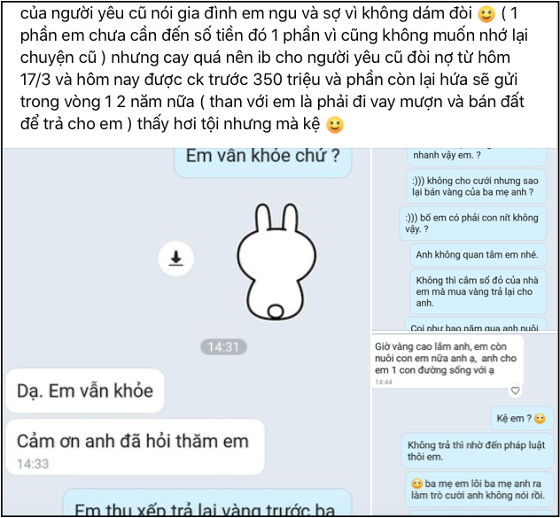 "Hôm nay, em nghe tin bố của người yêu cũ nói gia đình em ngu và sợ vì không dám đòi vàng. Một phần em chưa cần đến số tiền đó, phần vì không muốn nhớ lại chuyện cũ. Tuy nhiên em cay quá nên đã nhắn cho người yêu cũ đòi nợ từ hôm 17/3 và đòi được 350 triệu. Phần còn lại hứa sẽ gửi trong vòng 1-2 năm tới. Than với em phải đi vay mượn và bán đất trả cho em. Thấy hơi tội mà thôi cũng kệ", người đàn ông kể thêm.