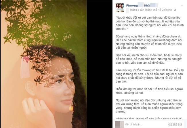 Clip Nhã Phương thân mật tình cảm với Nguyễn Trần Trung Quân gây bão dư luậnTrước những bàn tán, Nhã Phương đã mượn lời nữ nhà văn trẻ Gào để phân tích lẽ thiệt hơn. "Đọc bài viết của Gào mà thấm", Nhã Phương than thở.Mở đầu, Nữ diễn viên Tuổi thanh xuân tự nhủ bản thân: "Người khác đối xử với bạn thế nào, đó là nghiệp của họ. Bạn đối xử với họ thế nào, là nghiệp của bạn. Cho nên, không sợ người nói xấu, chỉ sợ mình làm xấu".