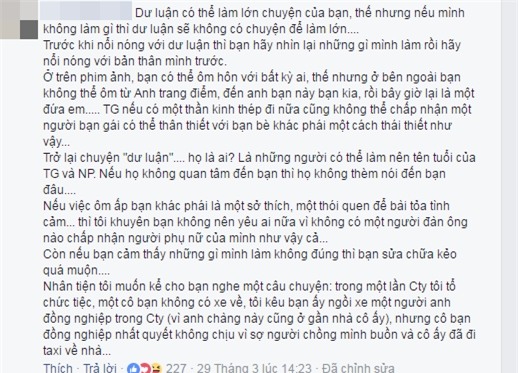 "Ở trên phim ảnh, bạn có thể ôm hôn bất kỳ ai, nhưng ở bên ngoài bạn không thể ôm từ anh trang điểm đến anh bạn này bạn kia, rồi bây giờ lại là đứa em.... Trường Giang nếu có thần kinh thép đi nữa cũng không thể chấp nhận người bạn gái có thể thân thiết với bạn bè khác phái một cách tha thiết như vậy", một fan gửi lời đến Nhã Phương.