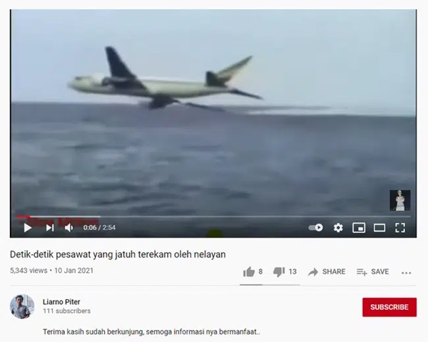 Trên nhiều trang mạng xã hội như Facebook, Twitter, Instagram và Youtube chia sẻ đoạn video với chú thích rằng đó là cảnh chiếc máy bay mang số hiệu SJ 182 của hãng hàng không Sriwijaya Air (Indonesia) gặp nạn trên vùng biển giữa hai đảo Laki và Lancang, ngoài khơi Jakarta.