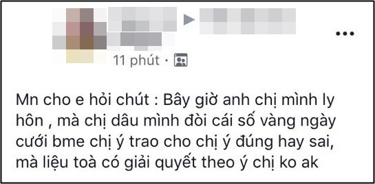"Mọi người cho em hỏi chút: Bây giờ anh chị mình ly hôn, mà chị dâu mình đòi cái số vàng ngày cưới bố mẹ chị ý trao cho chị ý đúng hay sai, mà liệu tòa có giải quyết theo ý chị không ạ?"