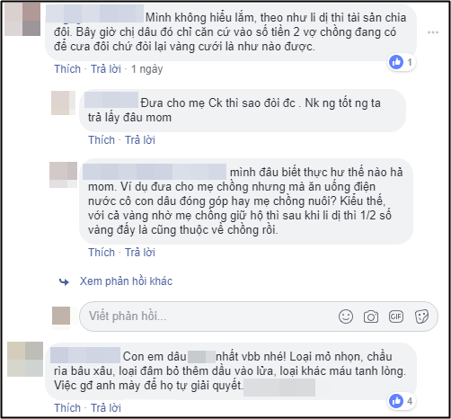 Bên cạnh đó, cũng có những ý kiến cho rằng bài đăng chưa đủ dữ kiện nên không thể kết luận, chẳng hạn như bình luận từ bạn Y.U: "Còn phải xem anh chị bạn cưới nhau bao lâu rồi, số vàng cưới ấy đã được sử dụng chưa, cho mục đích gì. Nếu đã tiêu vào việc nhà cửa, con cái chung của hai vợ chồng thì không thể đòi lại được. Còn nếu trước đây chị dâu bạn gửi mẹ chồng giữ hộ, thì bây giờ ly dị người ta được quyền đòi lại chứ."