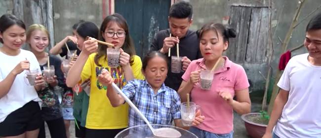 Và tất nhiên, một mình bà Tân thì không thể uống hết được. Cũng như mọi lần, chỉ cần hô một câu "các cháu ơi" là các cháu của bà Tân kéo ra lũ lượt để cùng nhau thưởng thức sản phẩm khổng lồ mà bà Tân vừa làm xong.