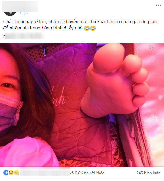 Cô nàng đã selfie một tấm chụp và bức xúc đăng tải lên một hội nhóm trẻ đông đảo thành viên: ''Chắc hôm nay lễ lớn, nhà xe khuyến mãi cho khách món chân gà Đông Tảo để nhâm nhi trong hành trình đi ấy nhờ''.