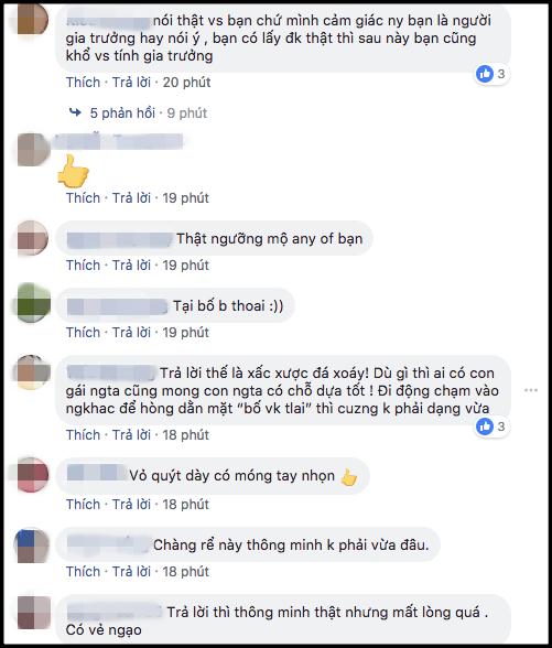 Ngay sau khi đăng tải, bài đăng này đã nhanh chóng thu hút sự chú ý của đông đảo mọi người. Một số người tỏ ra khá thích chí và cho rằng anh con rể này rõ thông minh, dùng chính câu hỏi của ông bố vợ để hỏi ngược lại, kết quả cũng đánh đúng điểm yếu của đối phương. Bản thân bố vợ ngày xưa cũng không thể lo cho vợ con mình nhà cửa, tại sao bây giờ lại áp đặt con rể làm điều đó?