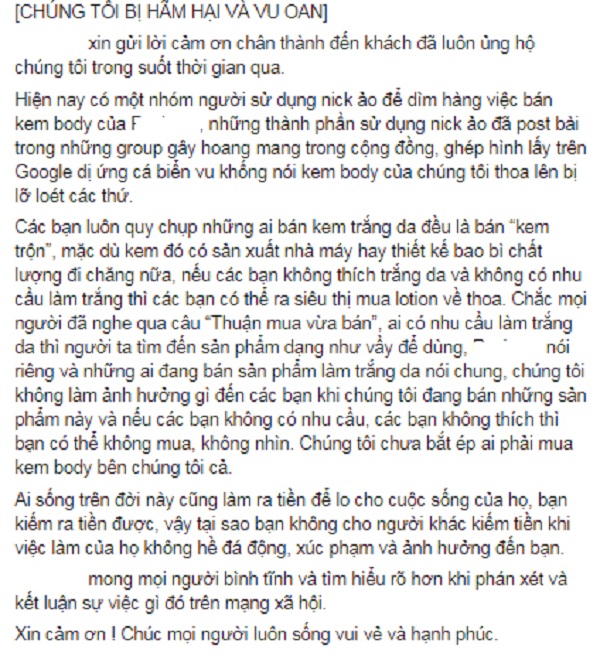 "Chào mọi người. Mong mọi người đọc và hiểu. Các bạn có thể không thích mình nhưng những việc mình làm hoàn toàn không ảnh hưởng đến đời sống hay tâm lý của các bạn. Việc bán mĩ phẩm hay nói thẳng ra bán kem trắng da, từ showbiz cho đến ngoài đời không phải là việc xa lạ nữa.