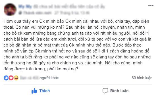 Bước tiếp theo mình sẽ vẫn ép chồng mình trả hết nợ rồi sau đó sẽ li dị 1 cách đàng hoàng để anh ta biết rằng, không phải người vợ nào cũng sẽ giang tay đón họ sau những tổn thương họ đã gây ra cho chính người vợ của mình. Nói cho cùng, mình đáng được trân trọng, phải không mọi người?".