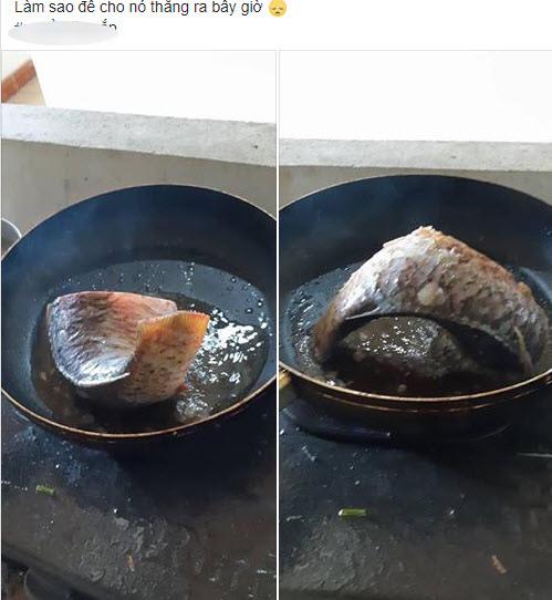 Khi bạn sinh ra là một con cá thẳng nhưng người rán lại khiến bạn bị cong, phải làm sao đây? Đăng bức ảnh miếng cá trên chảo với lời khóc mếu “Làm sao để nó thẳng ra bây giờ”, chàng trai ngay lập tức khiến cư dân mạng cười bò.
