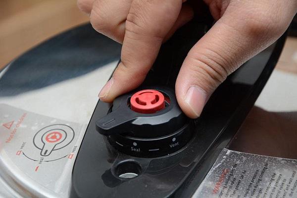 Phải khi nắp nồi không còn bị áp lực bên trong làm gắn chặt vào thanh gài thì lúc đó hãy xoay nắp thật chậm để hơi nóng bên trong thoát ra. Khi mở nắp nồi, bạn nên nghiêng mình sang một bên để tránh hơi nóng không bốc vào mặt.
