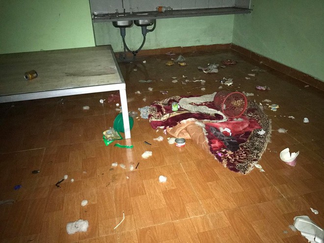 Vỏ chăn, hoa quả bánh kẹo vứt la liệt dưới nền