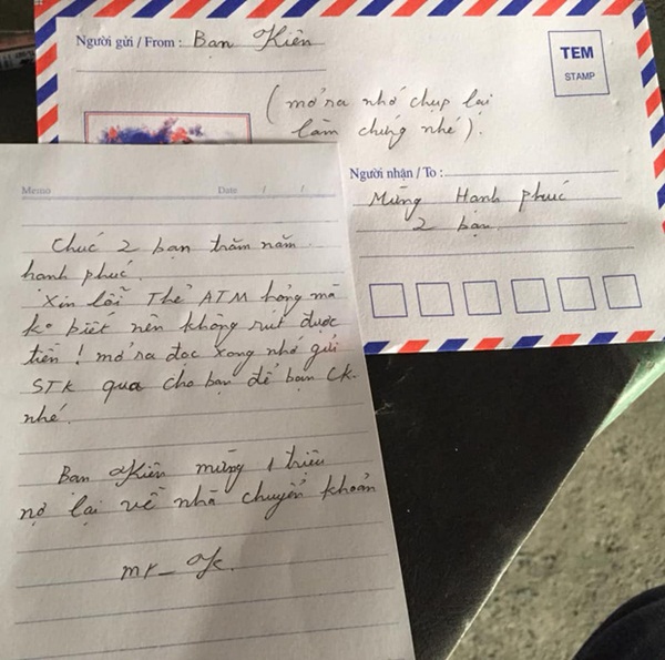 Ở phía ngược lại, anh Kiên cho biết: "Bọn mình mình chơi với nhau cũng 10 năm nay. Là bạn đại học nên ngày trước sinh viên, bọn mình hay trêu đùa sau này đứa này cưới mà không có tiền sẽ ghi phong bì: "Bạn Kiên mừng 500k đưa trước 200k nợ lại 300k" rồi ngược lại, khi người còn lại cưới sẽ là: "Bạn Mỹ mừng 500k đòi nợ 300k nợ lại 200k". Ai ngờ câu đùa ngày đó thành sự thật luôn".