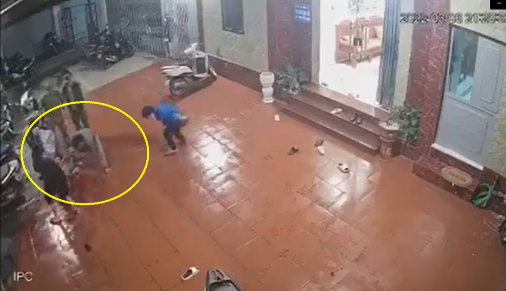 Một lúc sau, nam thanh niên cởi trần chạy ra ngoài sân bỗng bị quây 4 phía. Hai người đàn ông hùng hổ, cầm theo dao và vật dài giống kiếm, chém nhiều nhát vào người thanh niên này. Nạn nhân giãy giụa, tìm cách thoát nhưng bị hai người đàn ông ghim chặt.
