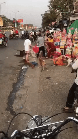 Thấy nhóm người giằng co, đánh nhau ồn ào mấy con chó nhỏ liên tục chạy nháo nhác xung quanh để theo dõi cảnh tượng hỗn loạn.