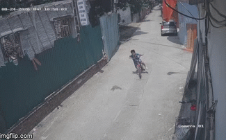 Camera an ninh của một ngôi nhà đã ghi lại toàn bộ quá trình xảy ra sự cố của cậu bé đi xe đạp. Chẳng là vào khoảng trưa ngày hôm qua (24/8), khi đang hào hứng đạp xe trong ngõ vắng người thì cậu bé bất ngờ có màn cua "cực gắt", xe lao vào tường. Cú đâm đã khiến chiếc xe của cậu bé ngay lập tức rụng rời thành 3 khúc: Thân xe, ghi đông, bánh xe trước.