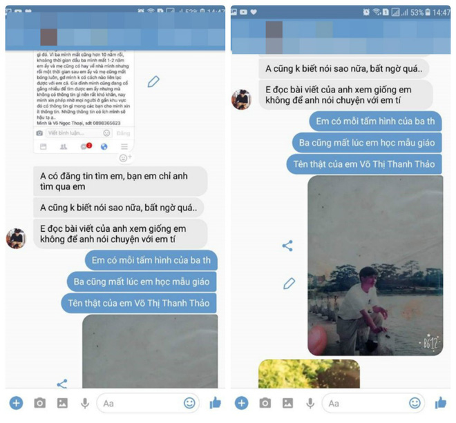 Ngày anh đăng bài là ngày 1/4, lúc đó mình đang đi làm thêm. Tầm 12 giờ bạn thân nhắn tin hỏi có anh không. Mình nửa vui nửa ngờ vì sợ nhầm lẫn. Nó cũng không đưa bài đăng hay thông tin gì cả. Sau đó mình nói chuyện với anh và nhận lại gia đình, cảm giác vỡ òa quá", Thảo chia sẻ câu chuyện của mình trong một group đông thành viên và nhận được nhiều sự chú ý từ dân mạng.