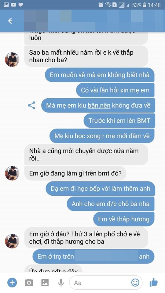 "Mình mất liên lạc với nhà suốt 10 năm. Ba mất từ lúc mình 5 tuổi do giật điện. Mình nhớ hồi đó có về nhà một lần sau nữa về một lần giỗ. Suốt hơn 10 năm mình không về thăm nhà phần vì còn nhỏ không biết đường, phần mẹ bận rộn nên chẳng thể đưa về cùng được.